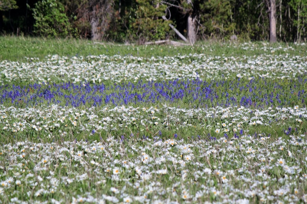 Several years ago we had been exploring some of the side roads in the caldera and we happened upon a field of blue wildflowers that was so dense it looked like water. In fact we thought it was water until we drove up to it and realized what it was. We had never been back to find that field, but had talked about it many times. As we headed down the scenic byway towards Harriman State Park, we happened upon a meadow densely packed with white wildflowers with patches of densely packed blue wildflowers. It still didn't equate to the original meadow from several years ago, but I decided to drive down the dirt road and view the flowers. At the end of the road there was a turnaround and a trail heading off to what looked like the rim of the canyon.